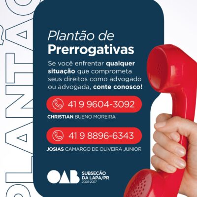 A OAB Lapa mantém um plantão exclusivo para proteger as prerrogativas da advocacia e assegurar o pleno exercício profissional. Se você enfrentar qualquer situação que comprometa seus direitos como advogado ou advogada, conte conosco! Contato do plantão: (41) 99604-3092 / (41) 98896-6343 Estamos ao seu lado, sempre prontos para defender...