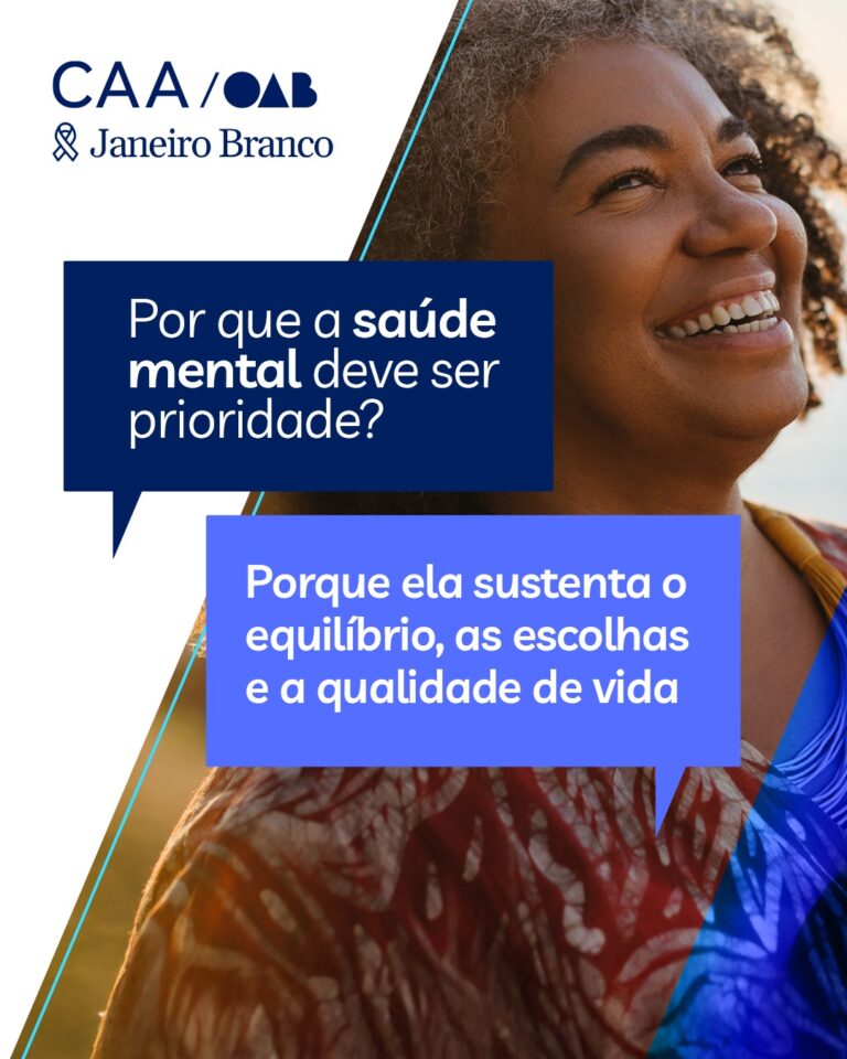 #ParaTodosVerem Card assinado pela CAA-PR, ilustrado com a imagem de uma advogada madura, sorridente, nas cores branco, azul escuro e azul claro informa: Janeiro Branco – Por que a saúde mental deve ser prioridade? Porque ela sustenta o equilíbrio, as escolhas e a qualidade de vida.