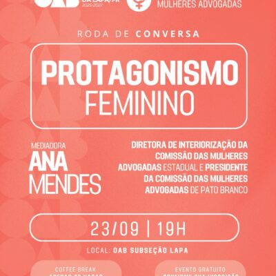 A OAB Subseção da Lapa e a Comissão das Mulheres Advogadas convidam você para um momento especial de escuta, troca e fortalecimento da voz feminina 23/09/2025 19h Sede da Subseção da Lapa/PR Tema: Protagonismo Feminino Mediadora: Ana Mendes — Diretora de Interiorização da Comissão das Mulheres Advogadas da OAB/PR e...