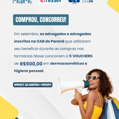 Em setembro, os advogados e advogadas inscritos na OAB Paraná que utilizarem seu benefício durante as compras nas lojas Nissei concorrem automaticamente a 5 vouchers de R$500,00 em dermocosméticos e higiene pessoal. Regulamento: Cada compra aumenta suas chances de ganhar; O prêmio não poderá ser trocado por dinheiro ou outros...