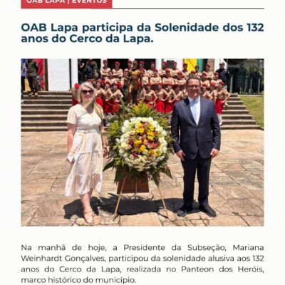 Na manhã de hoje (06.02) a Presidente da Subseção, Mariana Weinhardt Gonçalves, participou da solenidade alusiva aos 132 anos do Cerco da Lapa, realizada no Panteon dos Heróis, marco histórico do município. A OAB Lapa agradece o convite e a oportunidade de participar deste importante momento de valorização da história,...