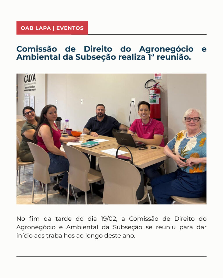 No fim da tarde do dia 19/02, a Comissão de Direito do Agronegócio e Direito Ambiental da Subseção se reuniu para dar início aos trabalhos ao longo deste ano.