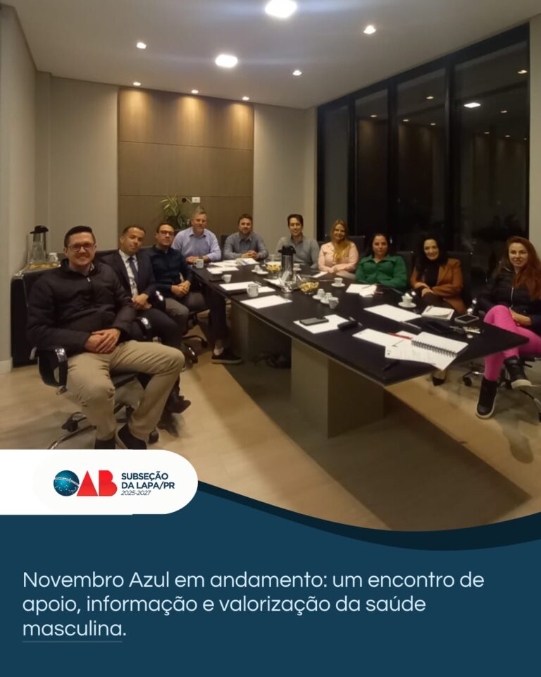 Na noite de ontem, 28/10, o Vice-Presidente da Subseção, Flávio Ribas Cassou, se reuniu com demais membros da Diretoria, Comissões de Eventos, Esportes, Saúde e Caixa de Assistência dos Advogados para tratar da organização do evento Novembro Azul.